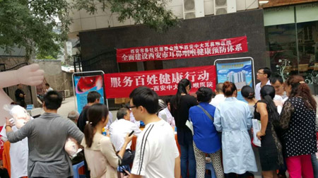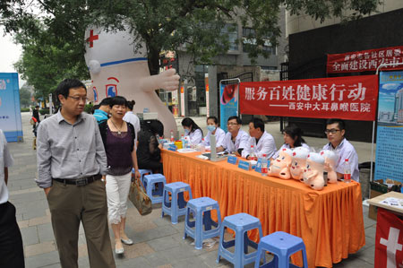 以西安新城中大耳鼻喉医院为代表的西安市17个医疗机构的200多名医务人员走上街头,为上千名市民进行健康查体和疾病宣传。